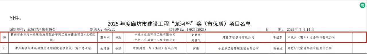 近日,河北省廊坊市建筑業(yè)協(xié)會公示了《關(guān)于公布2025年度廊坊市建設(shè)工程“龍河杯”獎(市優(yōu)質(zhì))工程項(xiàng)目名單的通知》,公司監(jiān)理的霸州市全市污水處理設(shè)施及配套管網(wǎng)工程全覆蓋項(xiàng)目(北部區(qū)域),憑借高標(biāo)準(zhǔn)的質(zhì)量管控體系與創(chuàng)新實(shí)踐的管理模式成功入選,榮膺廊坊市優(yōu)質(zhì)工程“龍河杯”獎。