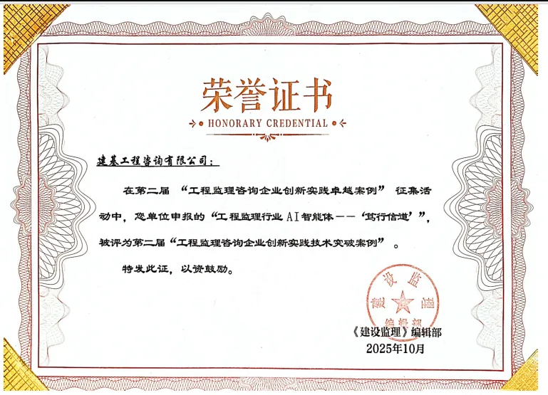 2025年10月30日,2025建設(shè)監(jiān)理創(chuàng)新發(fā)展交流會(第十期)在江蘇南京召開。公司《工程監(jiān)理行業(yè)AI智能體——“篤行信道”》案例,斬獲“技術(shù)突破案例”獎項,并在會上接受表彰。